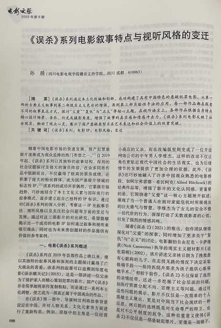 近日,我校孙晨老师撰写的论文《<误杀>系列电影叙事特点与视听风格的变迁》在全国中文核心期刊《电影文学》正式发表。