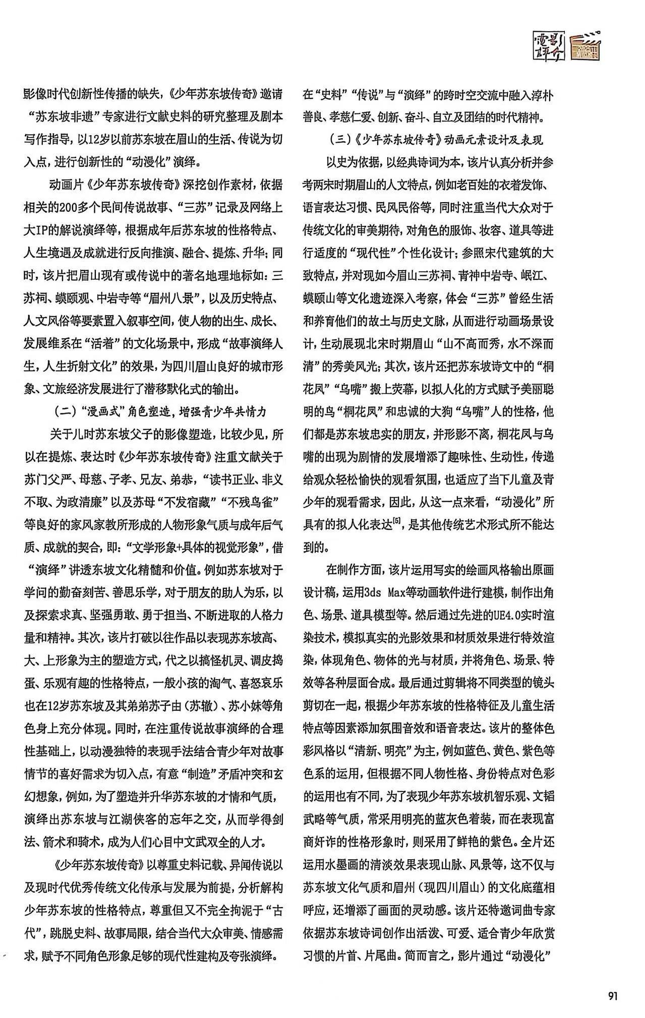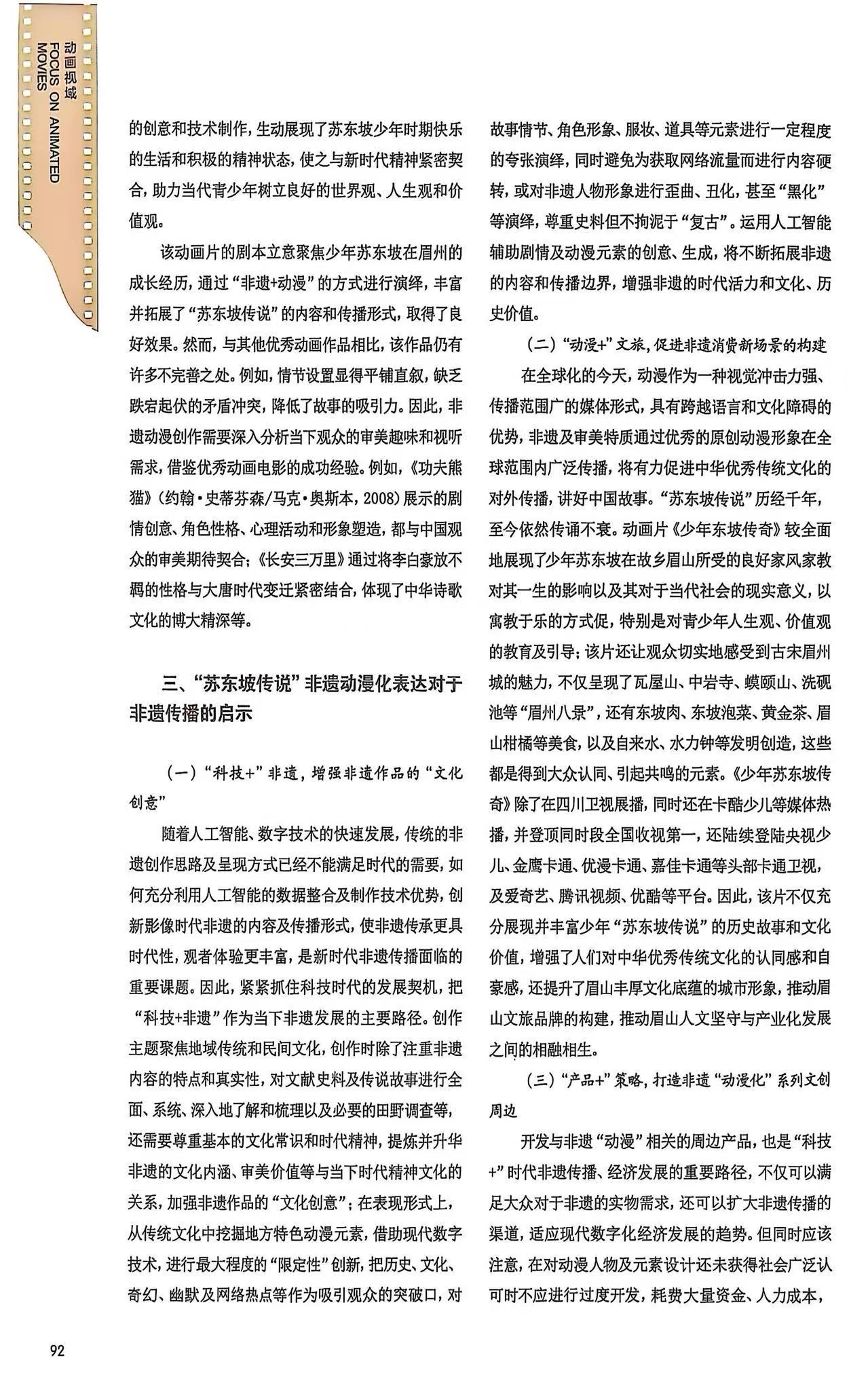 该文提出,随着网络短视频、微短剧、影视动漫、数字化沉浸式场景体验等“科技+非遗”模式的兴起,非遗保护和传承事业迎来了新的发展机遇。52集动画连续剧《少年苏东坡传奇》(刘新松,2022)采用动漫形式,深度挖掘并生动展现了苏东坡少年时期的成长轨迹及其家风家教的深厚文化底蕴。该剧不仅忠实地传承了非遗“苏东坡传说”的核心精神,还巧妙地融入了现代元素,赋予其鲜明的时代特色。本文以《少年苏东坡传奇》为案例,通过动漫这一现代媒介的生动演绎,探讨如何通过创意构思、元素设计、角色塑造以及制作技术等关键环节以趣味化的形式丰富东坡文化的内涵,展现千古文豪苏东坡的成长故事,以及“动漫化”表达在非遗传播中的独特价值与优势。
