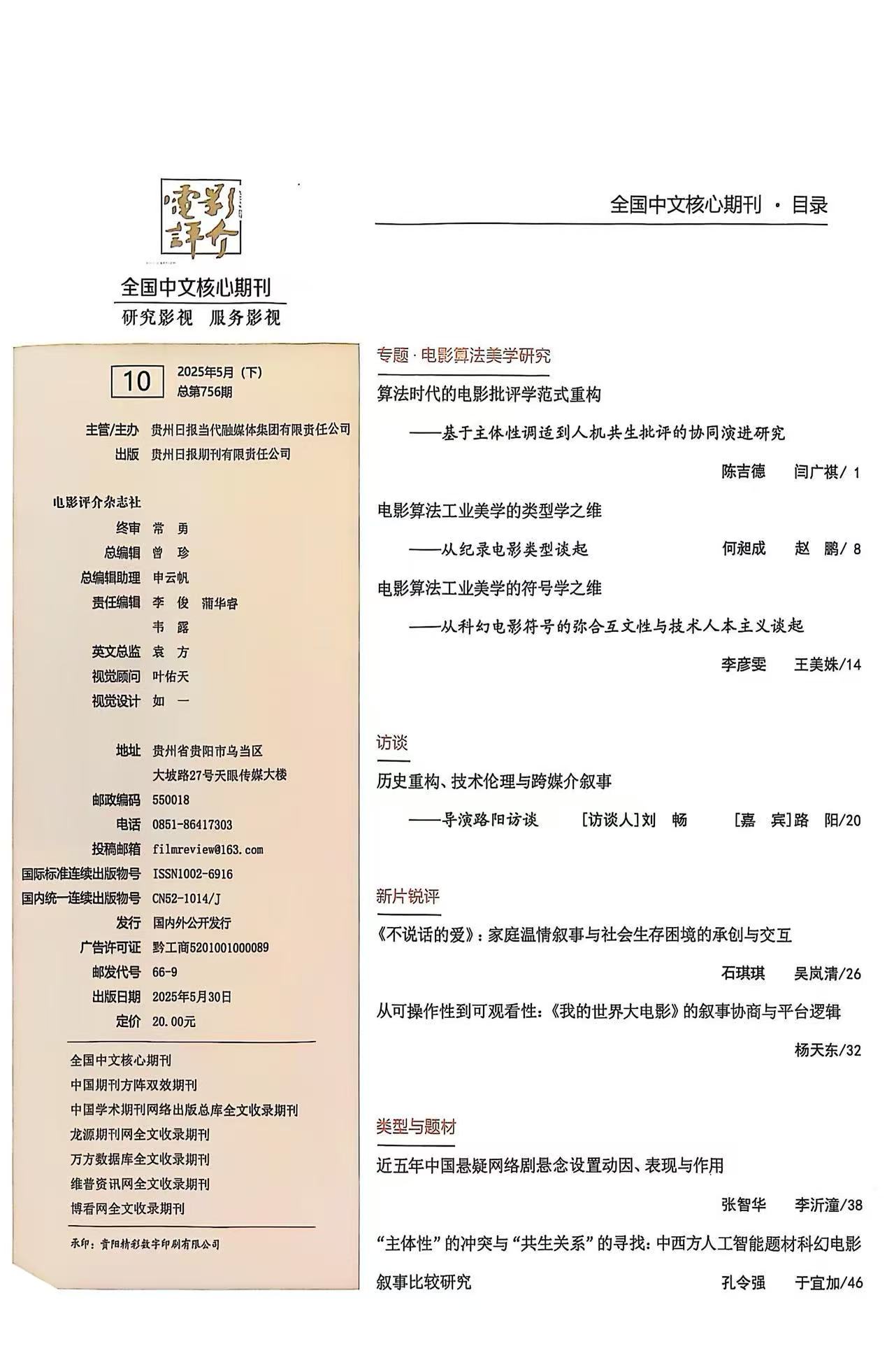 《电影评介》创刊于1979年,是一本在全国具有相当影响力、并具有海外发行权的电影专业刊物。创刊至今已经出版400期。单月最高发行量曾突破50万册,多次获得“全国影评工作先进集体”“贵州省优秀社科期刊”“贵州省报刊整体设计奖”以及中华人民共和国新闻出版总署授予的“双效”期刊等荣誉奖项。文章被国家新闻出版总署、维普网、万方数据库、知网数据库收录。主要栏目有:专家来稿、博士论坛、中国电影评论、外国电影评论、电影文学、电影理论、荧屏广角、影视教育、文化艺术等。主要内容包括:影视理论,影视文化,影视文艺,影视动画学,影视专题,影视管理,影视美学,影视文学,影视教育,影视布景,影视广告,影视产品营销,影视技术,影视服饰,影视效果设计,影视文献回顾,影视史研究,影视资料赏析,影视潮流分析,影视产业分析,影视前沿,影视人物采访,影视产业或创作与传播学,电脑,数码,美术,音乐,戏曲,舞蹈,艺术,新闻,传媒、传播学、哲学、社会、文化等各学科的交叉研究。北京大学《中文核心期刊要目总览》来源期刊:1992年(第一版),1996年(第二版),2004年版,2014年版,2017年版,2020年版,2023年版。(2023版)复合影响因子:0.29(2023版)综合影响因子:0.069,期刊荣誉:社科双效期刊。