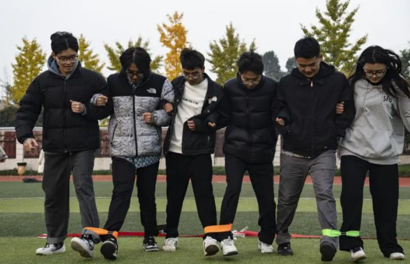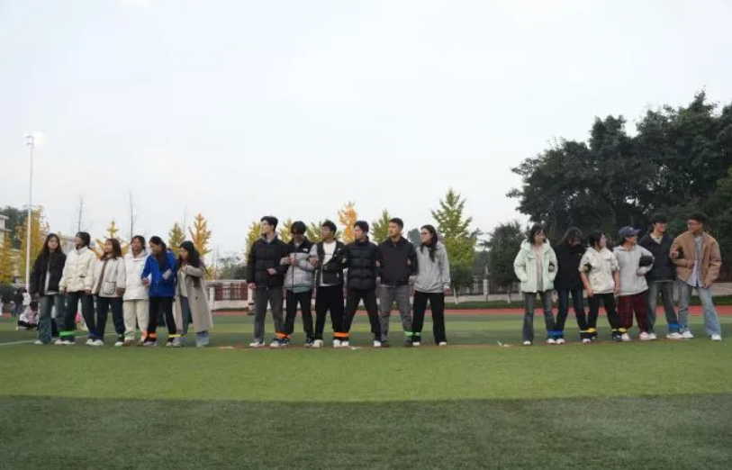 六人七足项目里,六名同学绑紧相邻脚腕组成“七足小队”,从起步时的笨拙到喊着“一二”口号稳步前行,在相互提醒与迁就中,既锻炼了肢体协调性,更凝聚着并肩同行的暖心力量。