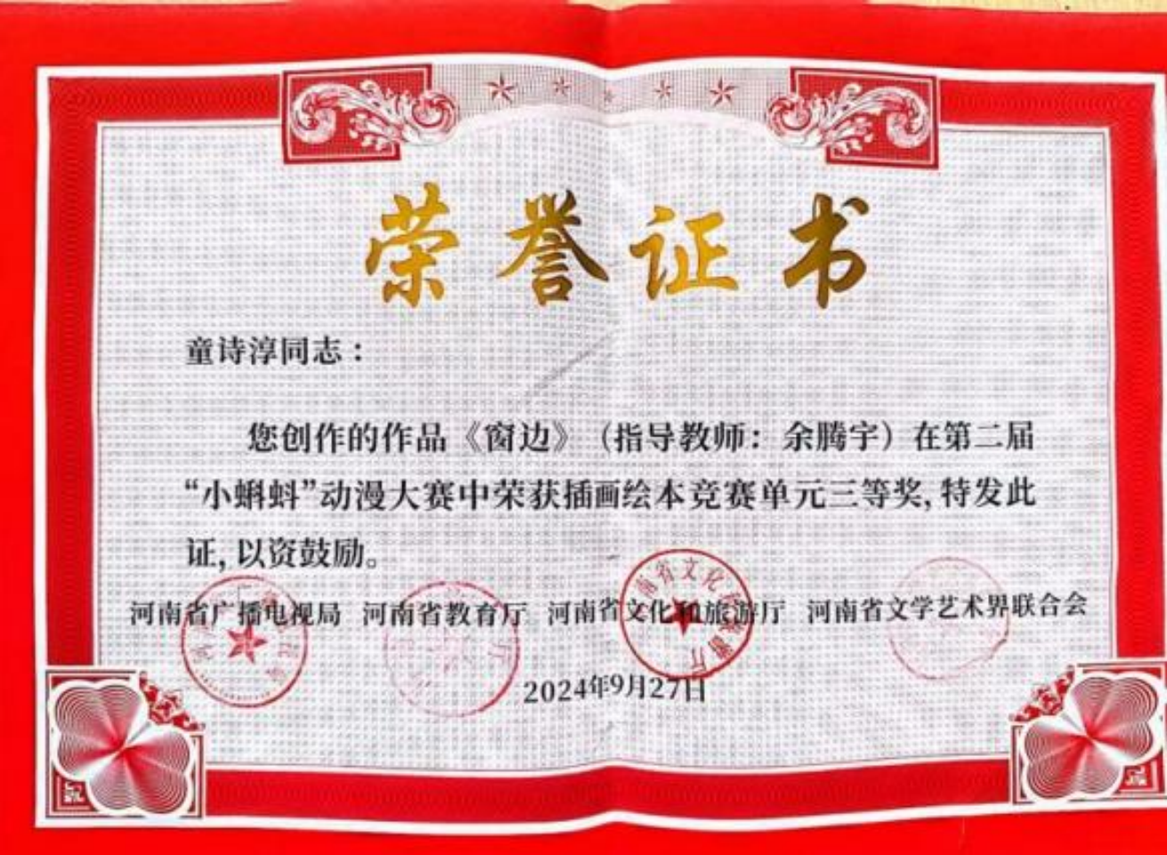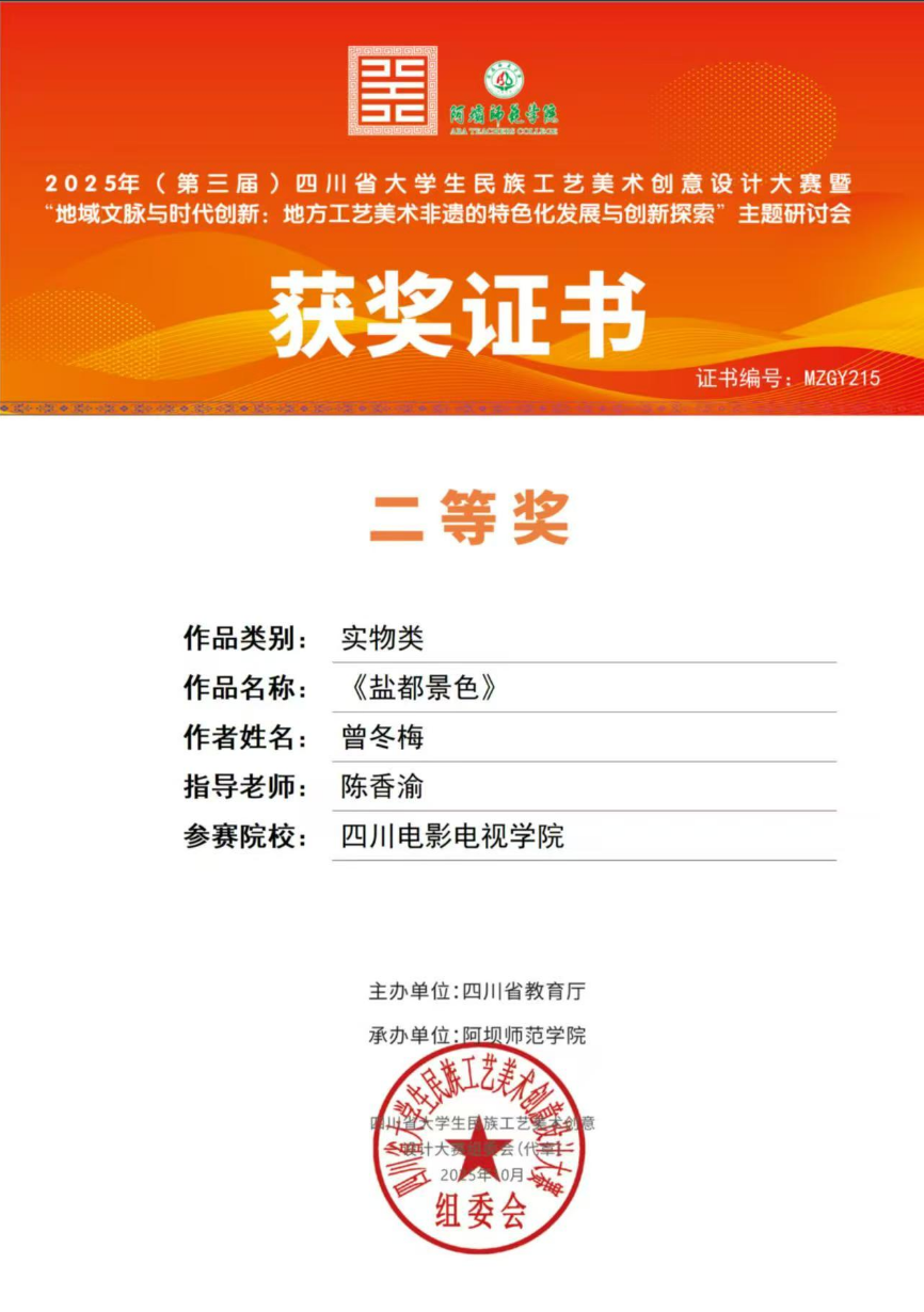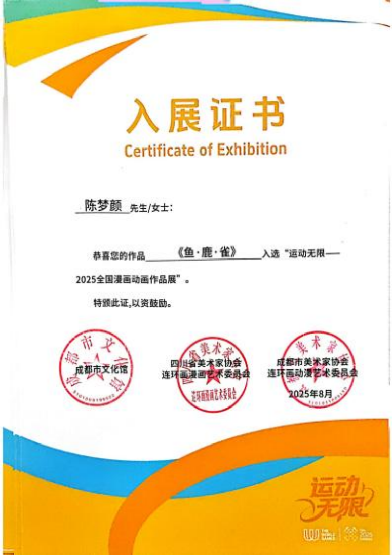 学生作品获奖第二届“小蝌蚪”动漫大赛;入选“运动无线——2025全国漫画动画作品展;获奖四川省大学生民族工艺美术创意设计大赛;入围中国美协艺委会学术研究展等