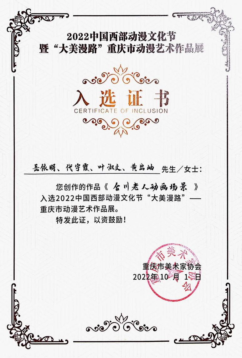 作品《合川老人动画场景》入选2022中国西部动漫文化节暨“大美漫路”重庆市动漫艺术作品展。作品《如愿》参展“丝路遗产·数字活化科技艺术展2022年(第二季)”。